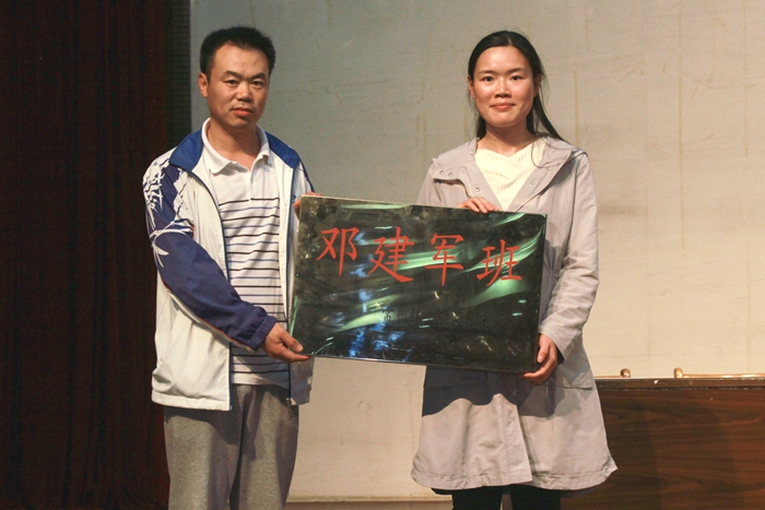 紧接着,邓建军班交接仪式开始,邓建军班是系部一项传统,电子系每一届班级中只有最出色的才能获此殊荣。15自动333班班主任沈叶菁老师从14机电334班班主任李炳虎老师手中接过了沉甸甸的“邓建军班”奖牌,这传递的不仅是一份荣誉,更传承着“爱岗敬业、自强不息”的邓建军精神。15自动333班班长刘强随后代表班级发表了获奖感言,他与大家分享了班级凝聚力和学风建设方面的作为,鼓励在场同学要风雨兼程拼搏。