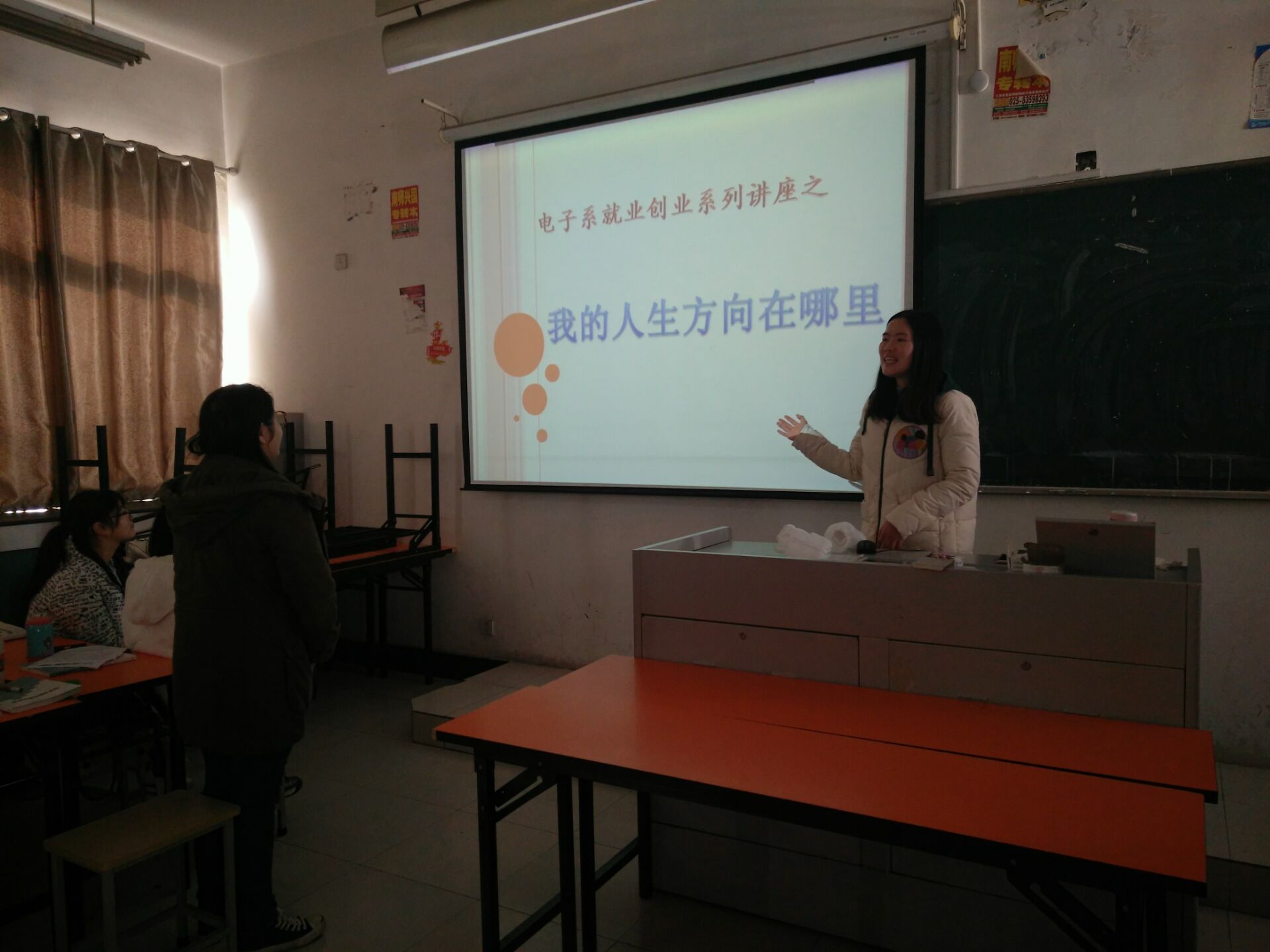 为了让明年暑假迈出校门的15级员工多方位了解电子系相关就业方向,开阔员工的职业视野,引导员工对从事电子类相关岗位的兴趣和积极性,培养员工的创业激情和创业思维,明确创业方向,提升员工创意思维和能力,帮扶员工成为电子行业优秀的创业和就业型人才。电子系于12月1日下午举办了就业创业系列讲座――我的人生方向在哪里。