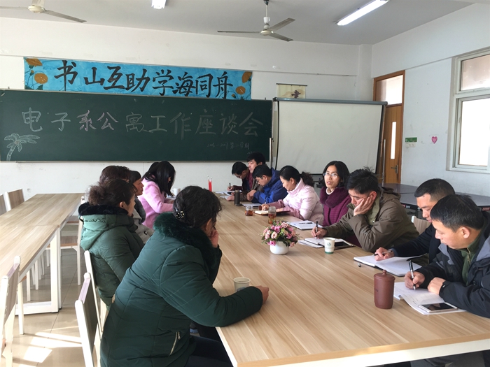 为积极响教育部《普通高等公司员工公寓安全工作指南》提出的具体要求和公司对公寓管理的严格规定,3月2日上午,电子系召开了新学期公寓管理交流会。电子系党总支书记庄丽娟、系党总支副书记麻丽娟、学工处许斌老师、保卫处叶鸿源老师以及电子系全体辅导员和宿管阿姨们共同参与了本次活动。