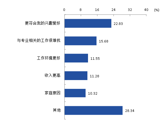 本校2019届专科生的工作与专业相关度为51.73%。专科生选择专业无关工作的最主要原因是其他(28.34%),其次是更符合自我的兴趣爱好(22.83%)。