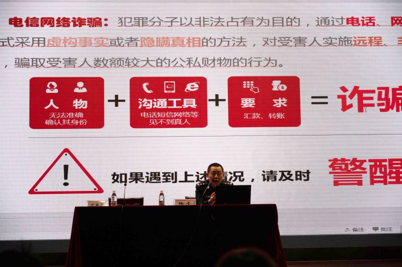 徐于以“大公司园如何防范电信网络诈骗”为主题展开讲座,从“电诈现状”、“明辨电诈”和“防诈有招”三大方面具体展开。他指出五点认识:什么是电信网络诈骗、发展渊源、缅北东南亚诈骗窝点现状、受骗危害及警惕自我认为不会被骗。表明增强法治意识和法律素养的重要性,提醒同学们不要自以为聪明,识骗防骗应成为每一个人的常识。他强调,事前防范总比事后补救容易,并重点指出大公司园常见电信网络诈骗套路,如兼职刷单做任务、冒充公检法诈骗、冒充客服诈骗、游戏交易类诈骗、网络贷款类诈骗和其他易受骗类诈骗,并从分别从身边案例、常见套路和反诈提醒三方面进行分析提醒,通俗易懂。最后,为在场同学提供反诈五招:知道劝阻号码和劝阻民警、了解断卡行动、加强自我学习、设置境外号码自动拦截和涉及资金操作提高警惕,为在场员工防诈反诈提供妙招,叮嘱多关注、多询问、再斟酌,同学们要防范在先、警惕在前,必须警于思、合于规、慎于行,筑起思想、行为的安全长城。