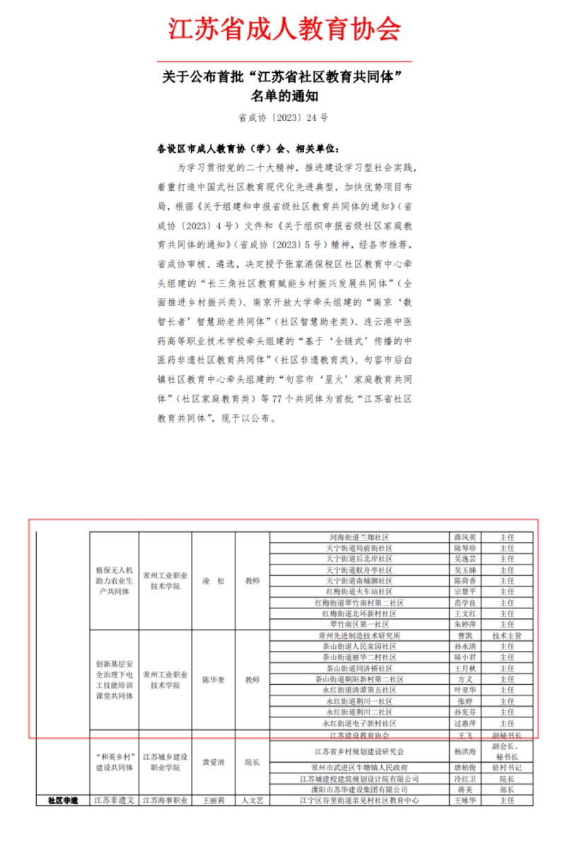 近日,江苏省成人教育协会发布《关于公布首批“江苏省社区教育共同体”名单的通知》(省成协〔2023〕24号),由yl23411永利官网凌松老师主持的“植保无人机助力农业生产共同体”和陈华奎老师主持的“创新基层安全治理下电工技能培训课堂共同体”两个项目成功获评首批“江苏省社区教育共同体”。