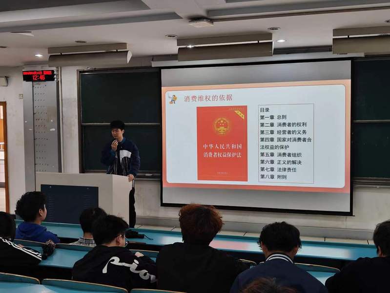 “同学们,你们有没有经历过买东西买到假货?去餐厅吃饭导致腹泻,食物中毒?出去旅游被收取不合理的费用?……”活动开始,陈云抛出一系列问题,迅速引起同学们的广泛讨论。随后他从消费者权益日介绍、如何维权、实用投诉电话三个方面展开交流讨论,在一问一答中,同学们无形之中“点亮消费维权技能”。