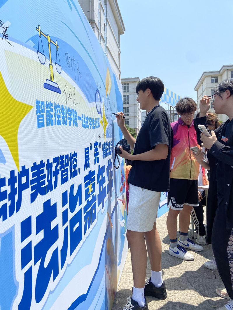 平安校园我守护签名—每一位“闯关者”自愿在活动背景墙上签名,承诺为推进“一站式”平安社区建设贡献自己的青春力量,正式开启法治闯关游戏。