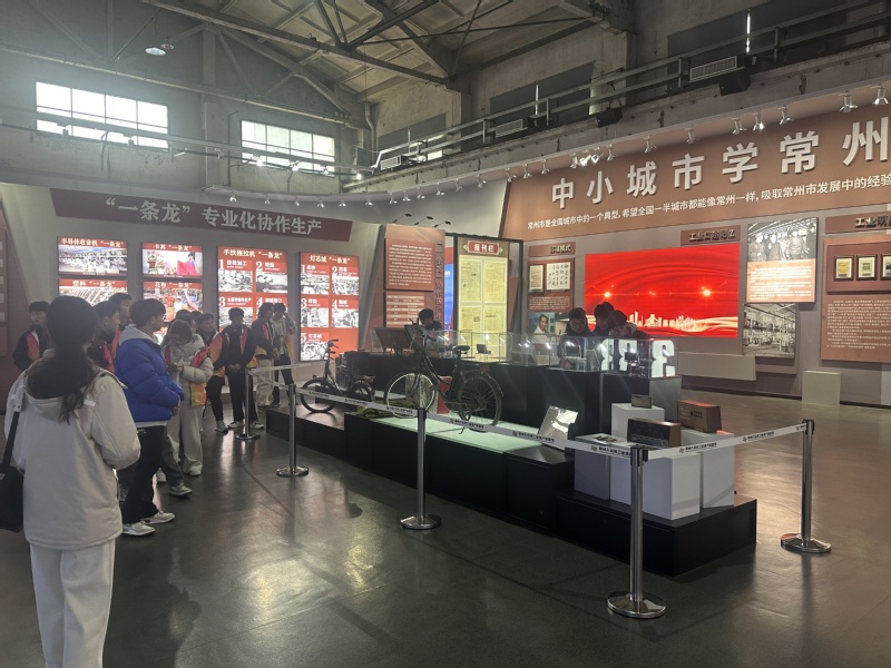 作为中国近代工业的重要发祥地,常州因运河而兴,工业遗产灿若星辰。展览馆坐落于中车戚墅堰机车有限公司原动力车间。师生们跟随讲解员,从“运河两岸烟囱林立”的分布图启程,穿越时空长廊。一件件饱经沧桑的工业设备,重现了纺织、机械制造等产业的辉煌历史。师生们驻足于“运河五号创意街区”展区前,感慨老厂房向文创产业的华丽转身,见证传统工业与时代创新的交融共生。
