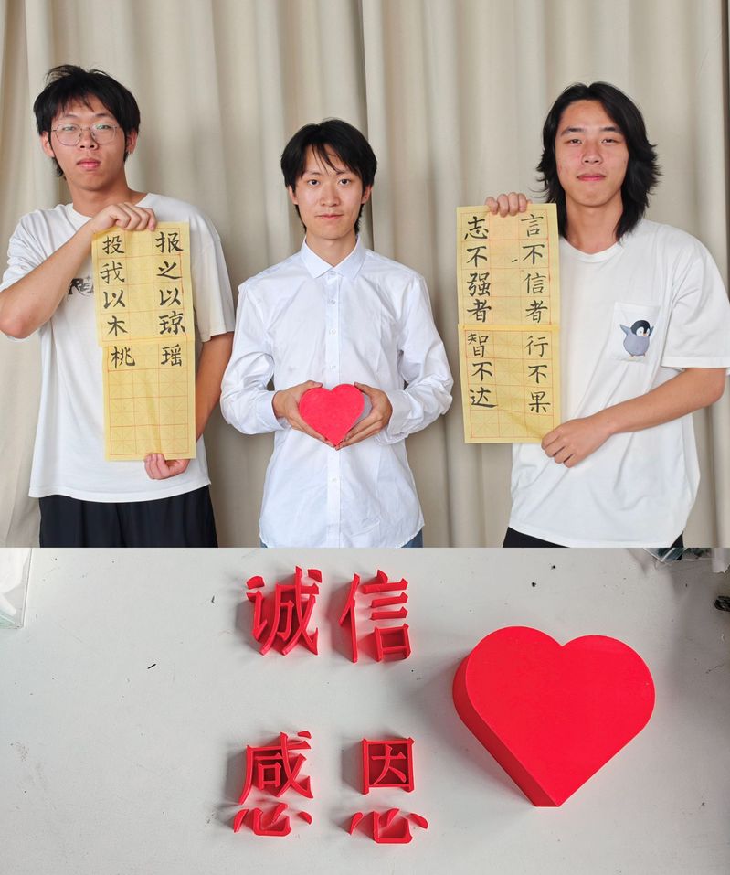诚信感恩手办模型制作活动将模型创作与情感表达相结合。同学们以“诚信”“感恩”为主题,用3D打印材料制作出富有创意的作品并配以书法展示。活动现场气氛热烈,2023级李三鑫同学展示作品时说道:“这件作品承载着我们对父母、师长和社会的感谢,也提醒自己要时刻坚守诚信。”活动通过实践体验,让诚信之心变得生动可感。