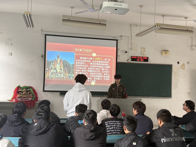 活动中,社长陈超系统介绍了国家级非遗黄沙狮子的悠久历史与艺术特色。黄沙狮子又称“上桌狮子”,起源于北宋庆历至皇祐年间,由拳师杨显枪创立狮子会,开创“狮子跳桌”技艺。其表演以“武舞一体”为核心特色,完美融合武术的刚健与舞蹈的韵律,更以在九尺二寸高的桌脚上凌空翻飞的“高、险、难”技巧而闻名遐迩,展现了传统民间艺术的精湛水准。